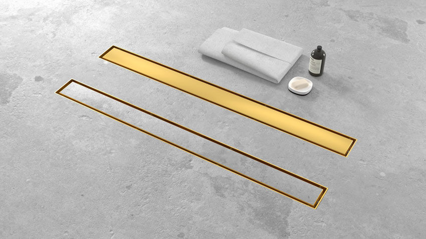 Canaleta / Desagüe de Ducha en Inox con Acabado PVD Dorado – Rejilla Lisa o Baldosa