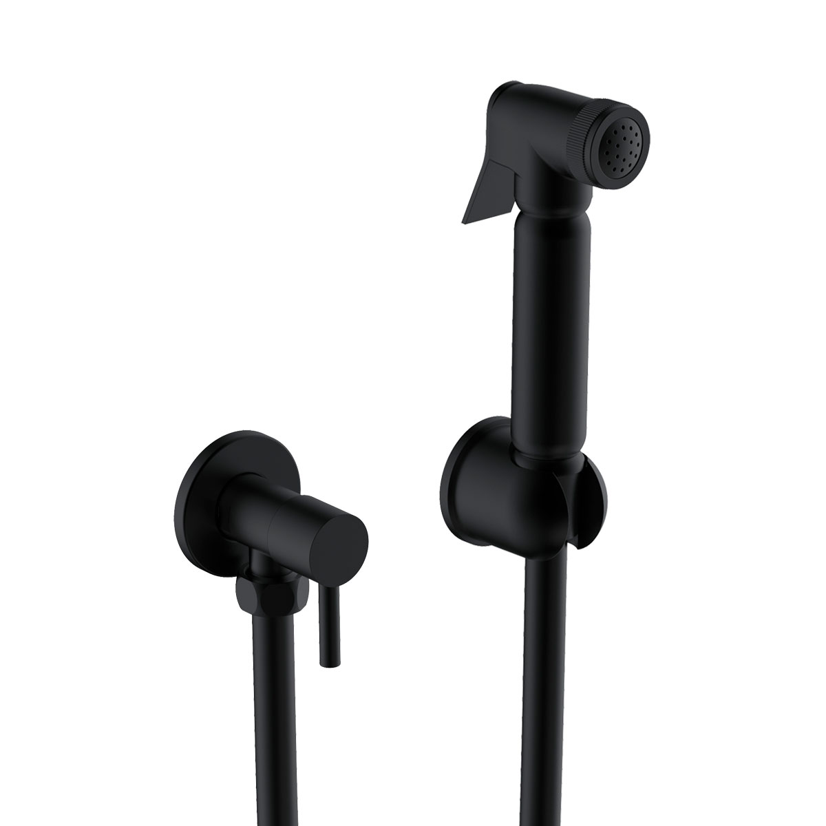 <br /> El kit incluye:<br /> • Ducha en latón con acabado negro<br /> • Manguito flexible revestido en PVD<br /> • Válvula monomando en latón negro<br /> • Soporte de fijación en latón negro<br /> • Conexiones universales G½" para instalación fácil y versátil<br /><br /> Con un diseño ergonómico, este kit permite un control suave del flujo de agua, combinando funcionalidad con estética contemporánea. Ideal para quienes buscan una solución de higiene discreta y sofisticada para el baño.</p> <br /> <h3>Especificaciones Técnicas:</h3> <ul> <li>Material principal (ducha, válvula y soporte): Latón con acabado negro</li> <li>Flexible: Revestido en PVD</li> <li>Tipo de válvula: Monomando</li> <li>Conexiones: G½" universales</li> <li>Compatibilidad: Instalación estándar para baño / WC</li> </ul> <br /> <h3>Beneficios / Características Destacadas:</h3> <ul> <li>Estética elegante y moderna con acabado negro discreto</li> <li>Flexible revestido en PVD que armoniza con el diseño negro</li> <li>Control suave del flujo de agua mediante válvula monomando</li> <li>Instalación sencilla con conexiones universales estándar</li> <li>Diseño ergonómico que conjuga funcionalidad y estilo</li> <li>Solución ideal para proyectos de higiene con sofisticación y rendimiento</li> </ul> ">